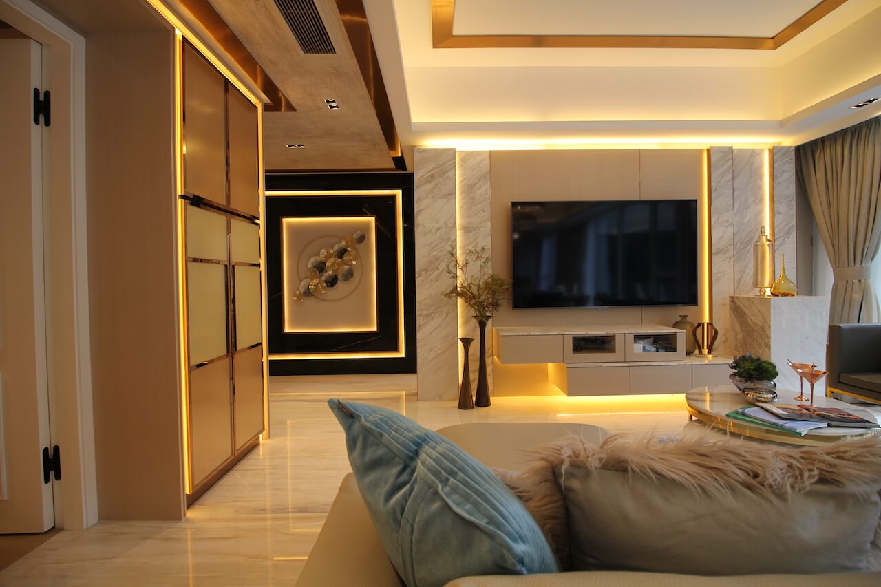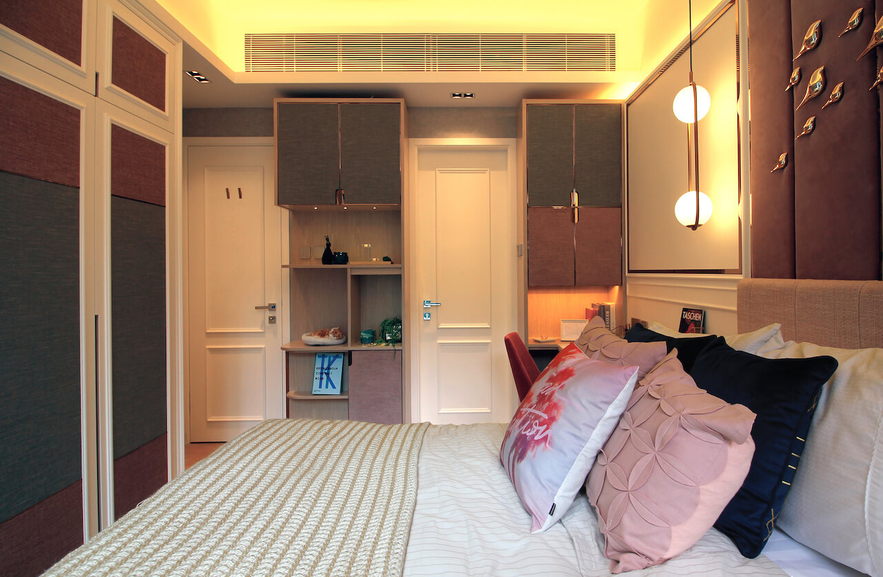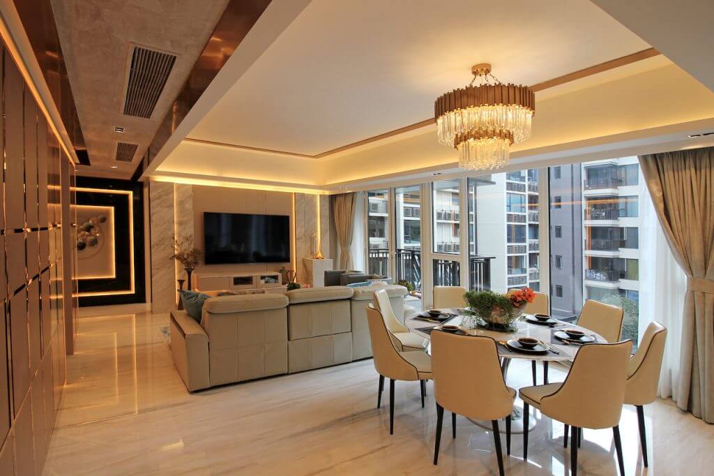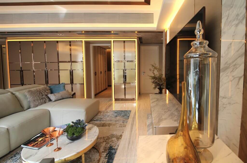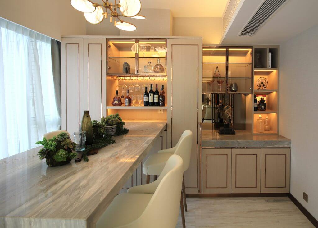 As soon as you enter the flat, a three-dimensional marble feature wall with light permeating effect on the four sides creates a calm and noble style. The whole house is equipped with a variety of different materials, including marble, metal, wood and leather. The spatial layout of the living room also presents clean and neat lines, from the position of the bar counter to the dining table to the coffee table, enriching the overall sense of hierarchy from high to low. The shoe cabinet door on the left side of the living room is made of steel, matching with the same color of upholstery fabric and wood veneer, making luxury and modernity juxtaposed.