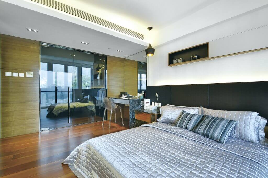 Nestled among neighboring white houses, this stylish single unit home featuring generous glass walls is an eye catching attraction. The floor-to- ceiling glass windows are made from high quality pellucid material to divide yet connect the interior with the open and scenic landscape. To maximize natural illumination and allow a panoramic view of the natural surroundings, designer Eric Fung appointed the home with impeccable decorative accessories and handpicked furniture. Beige forms the basis for theneutral colour scheme of beige enhanced by the surrounding nature; low furniture groupings allow for unrestricted observation of the exterior which blends in seamlessly with the interior design. Spaces are clearly defined by separating the living/dining areas from bedrooms located on different floors for privacy. The ground floor where the open kitchen and dining room are located exudes a sophisticated flair that echoes the garden vista outside the window facade. Walls are lined with silver mosaic tiles while light grey marble flooring and translucent Louis Ghost chairs by renowned designer Philippe Starck add sparkle to the heart of the home.
