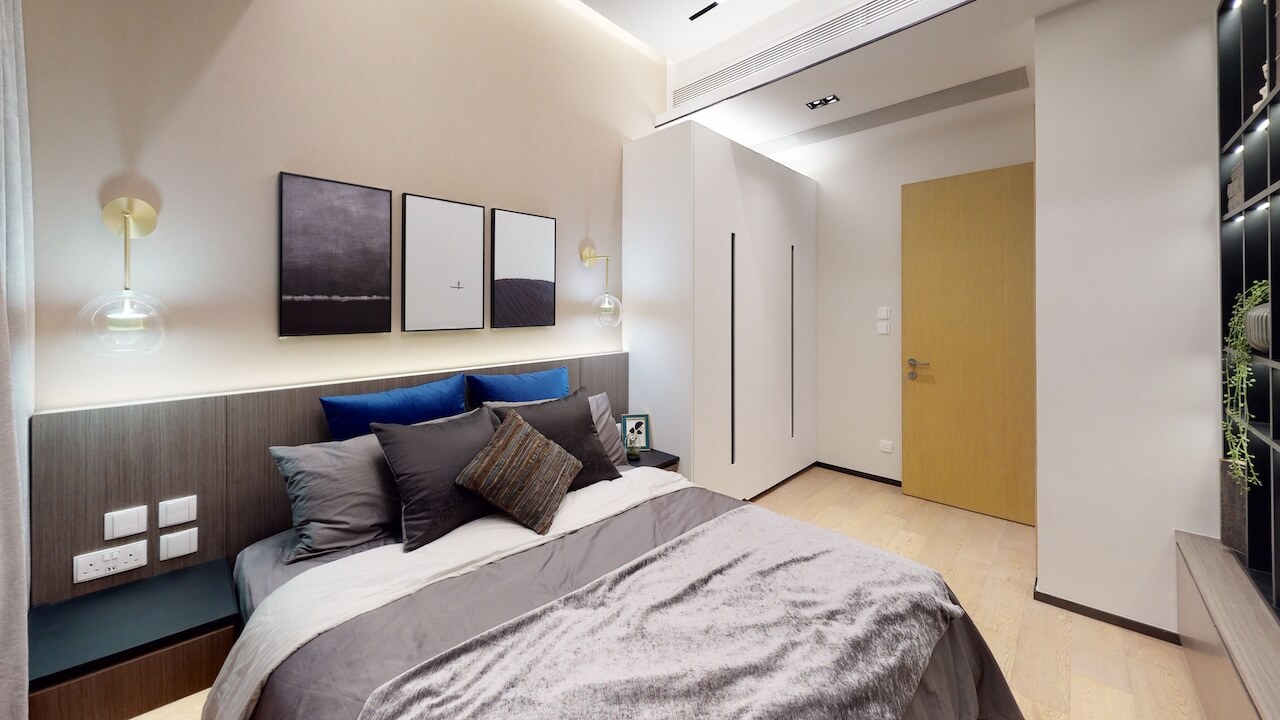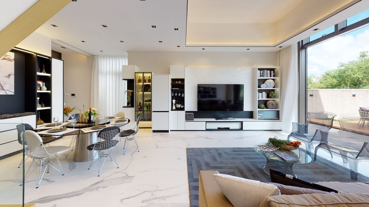 The project is located in the superior location of the traditional mansion in Cove Hill. The overall style is mainly simple, but full of fashion with a lot of white space and a small amount of black accents. The large floor-to-ceiling windows leading to the terrace and the white wall make the living room bright and bright, and the scenery is panoramic, away from the bustle of the city. The floor and TV wall are made of Italian marble nano-tiles with intricate patterns, which form a strong contrast with the darker dining tables, wall cabinets and other furniture, setting a comfortable and unique atmosphere for the entire space. The tall Buddhist Pine in the garden is a highlight, which incorporates a little Chinese element into the simple Western style house. The cabinet door and floor of the master bedroom are made of matte lacquer and different wood grains to complement each other, which is low profile and full of texture. The overall style of the bedroom uses warm colors to match, with light-colored wood grain, adding an elegant feeling.