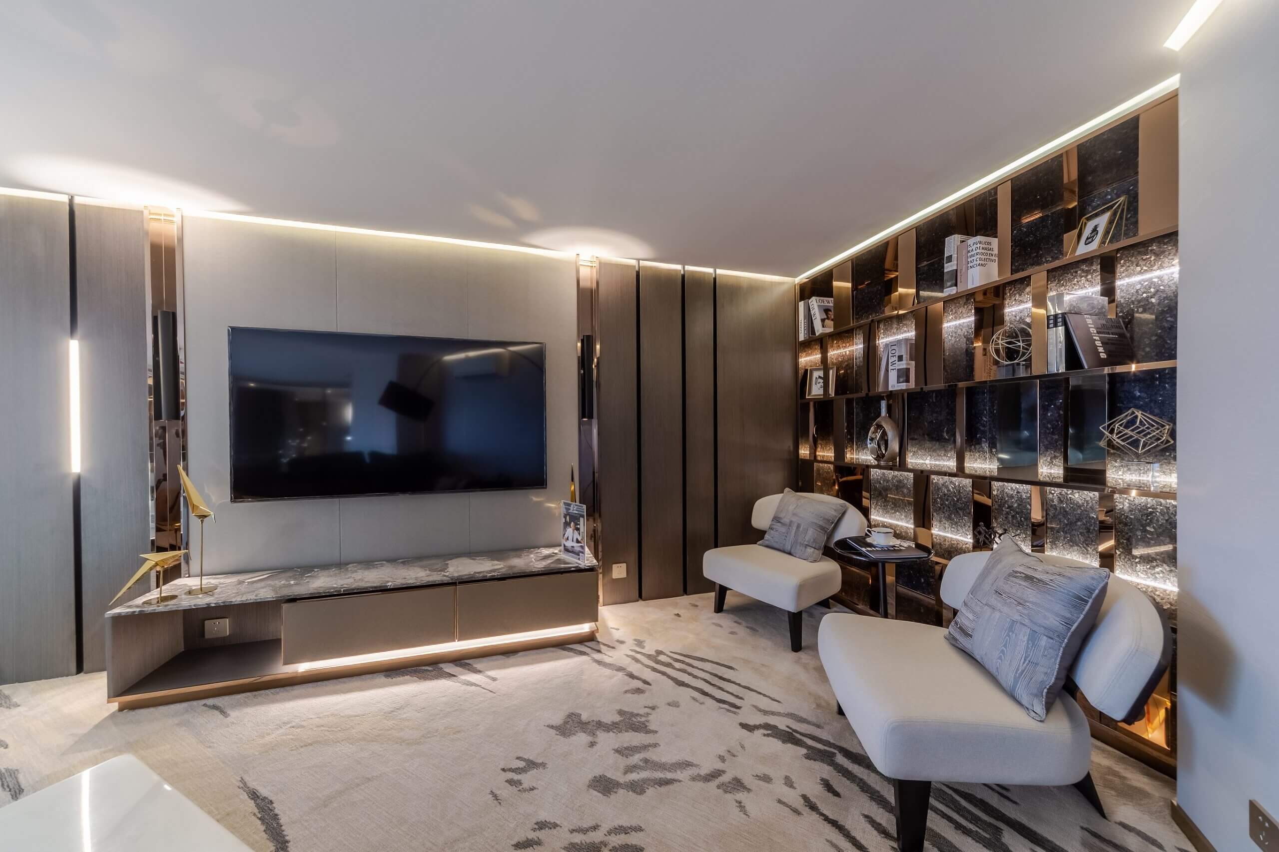 Entering the living room, what you see is a large piece of marble spread on the TV wall, matched with the calm wood, and embellished with steel branches, in contrast to the dark gray marble floor. In order to add a sense of hierarchy to the space, the large-scale furnishings in the house include sofas, coffee tables, dining tables, etc., all in shades, coffee, and tea. The characteristic pendant lamps with geometric lines are hung on the mezzanine ceiling, which is simple and stylish.