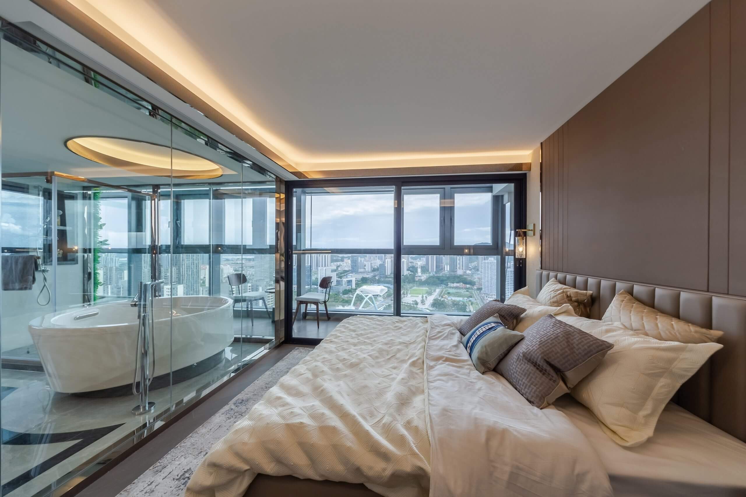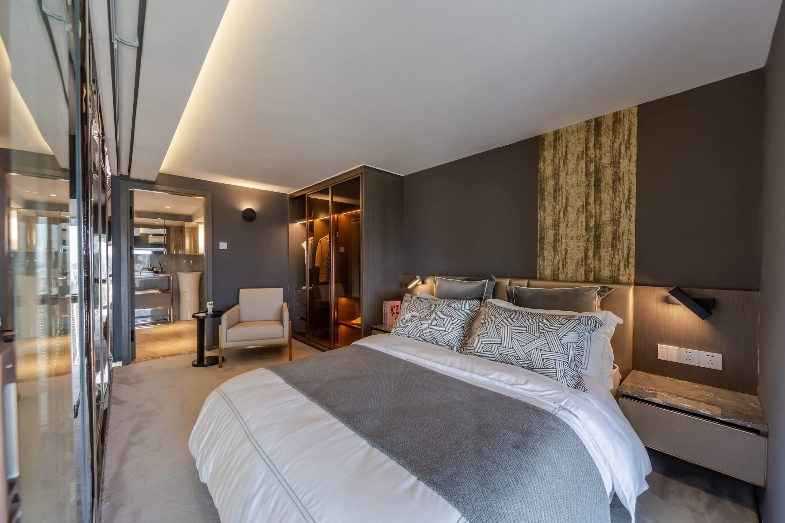 The master bedroom on the upper floor is dominated by earth colors, and the headboard uses wallpaper with different textures to create a characteristic wall, creating a simple and modern feeling. The floor is covered with light gray carpet. In order to create the greatest sense of space in the limited space, the designer uses the glass wall as the bathroom partition, which allows light and sight to penetrate each other. The black frame design on the glass wall and door echoes the design feeling of the lower level. consistency.