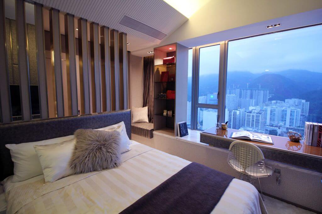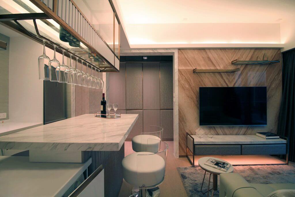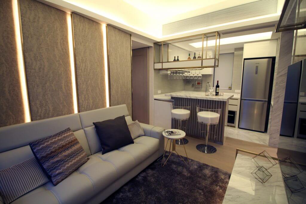 The foyer is paved with white-grey marble, the wall is set with large mirrors, and the ceiling is also set with a gray mirror. The visual space of the entrance is doubled, and the wall is decorated with a characteristic glass with a gold thread in the middle. There is a marble arch in the entrance of the living room. Since then, there has been a grandeur of the Millennium Mansion. The houseowner does not cook very often. In addition to the basic equipment, the kitchen also has a bar on the border. At the same time, the width of the kitchen can also be used as a dining table; it is compatible with the role of the dining room. There is a gold-steel frame glass hanger on the bar, which can be used to hang upside down glass wine glasses, as the lounge bar. Another desire of the female owner is that the bathroom has both a bathtub and a shower. If it is the original layout of the apartment, it is undoubtedly a luxury. However, after the two rooms were constructed into one, the designer is allowed to use part of the space in the bedroom to add a bathtub in the toilet, the shower room was also preserved. A glass is placed between the bathtub and the bedroom, allowing the owner to enjoy the outdoor view and the wall-mounted TV at the end of the bed.