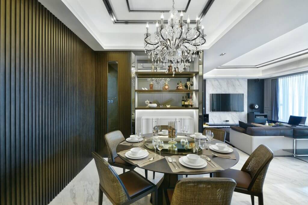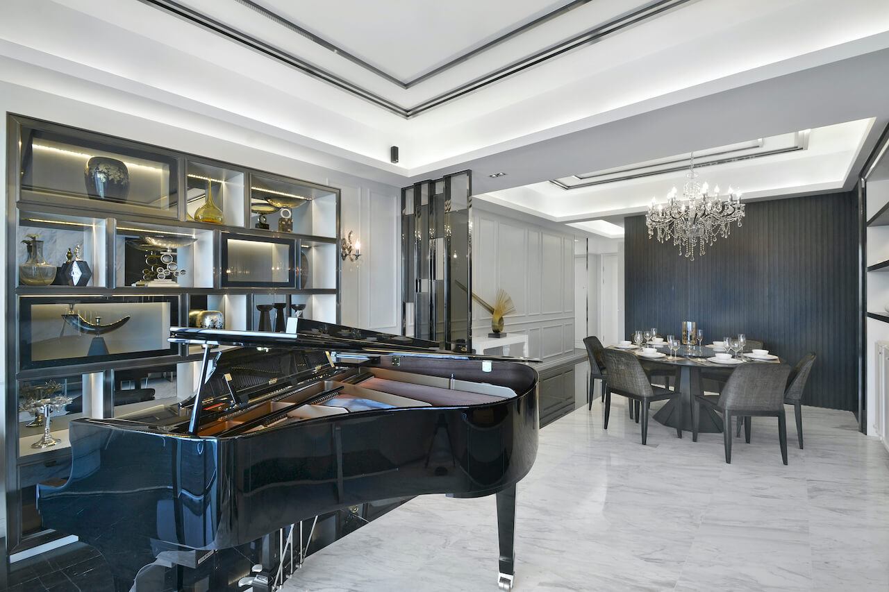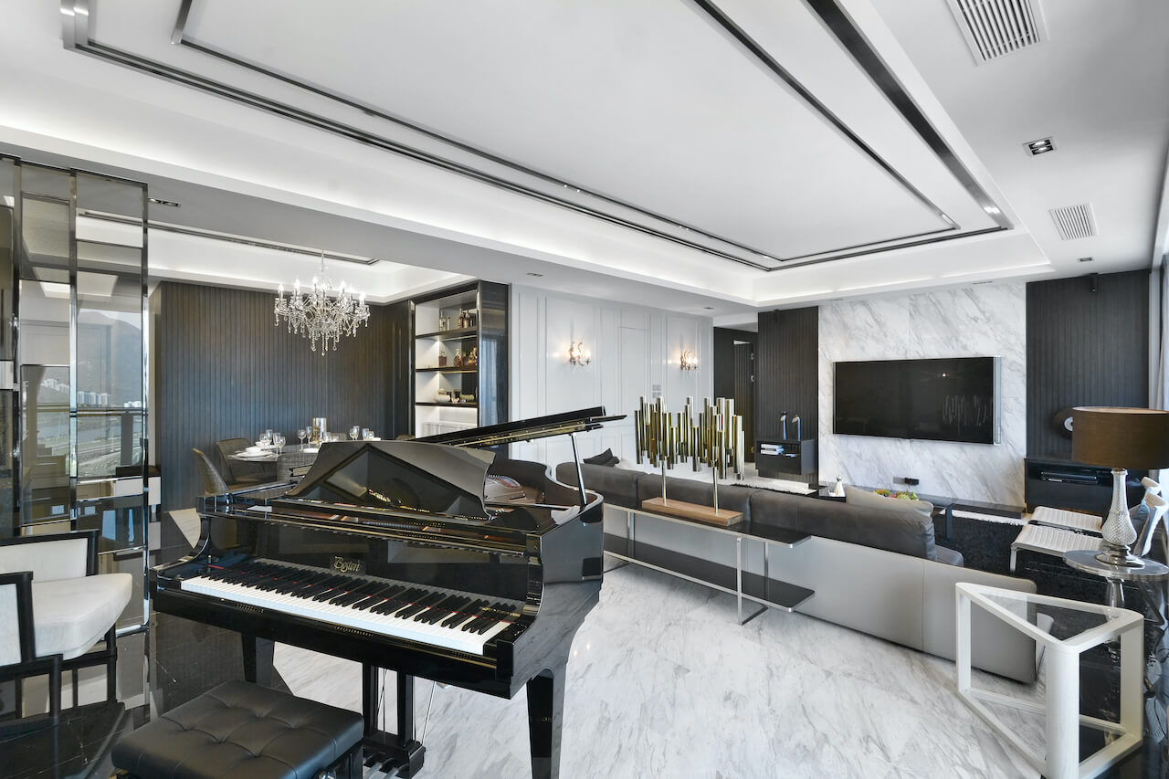 Black and white were used to matching with the stripe pattern to give a sense of space extension. The different layer of the house was built with the glass screen used to locate the different area in the living room.