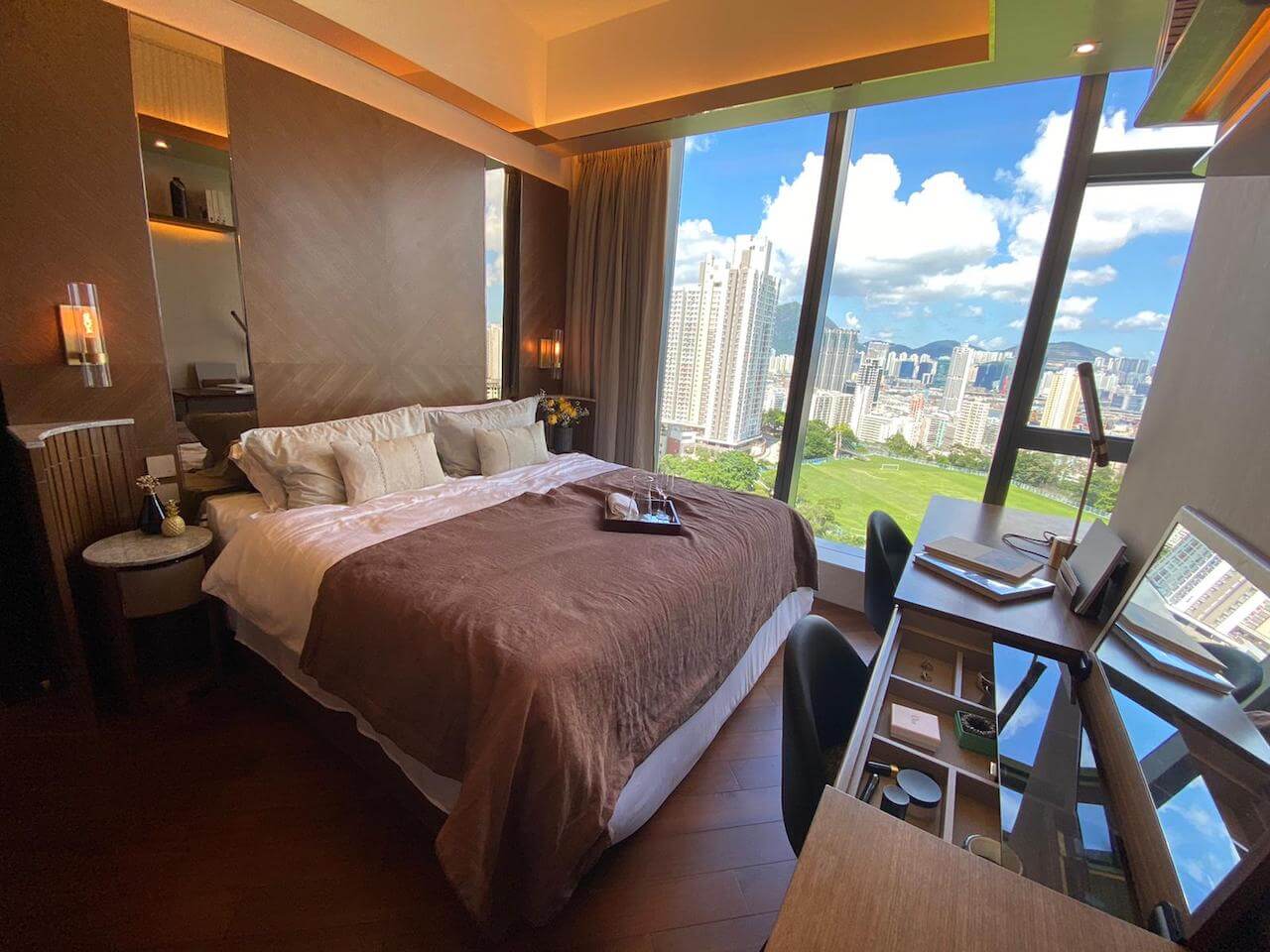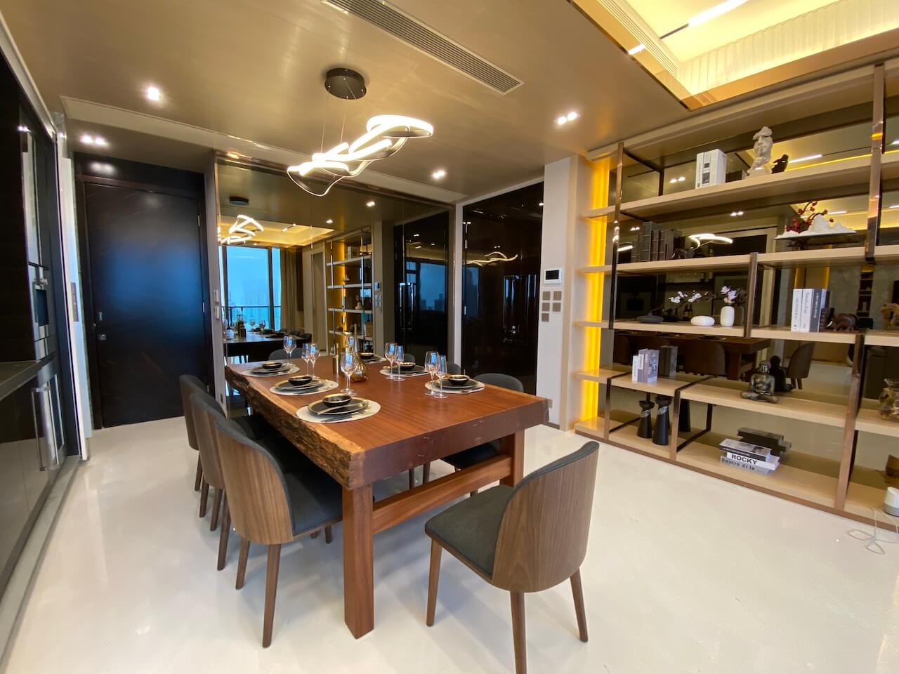 This case uses a calm dark wood color as the main theme. There are multiple dark brown mirrored walls in the living and dining room, which greatly increases the sense of space. With different shades of marble walls and floors, it creates a gradual effect to bring out lifestyle. The designer uses different materials such as mirrors, light and space intervals to match the interior design of the dark wood color to maintain a balance between enhancing the sense of space, and creating elegant and large homes through texture. The shelves, dining tables and ceilings of the living and dining rooms are also designed with wood grain, and the dark living room furnishings are complemented by the colors and the entire atmosphere, making it feel relaxed and elegant. The living room is also equipped with a large wine cabinet and B&O audio equipment, turning the entire living room into a small club. The design of the master bedroom and the dining room are closely linked. It can be seen that the floor and walls are replaced with a dark wood grain design, while the dressing table and bedside table are designed to complement each other with wood grain tones similar to the floor.