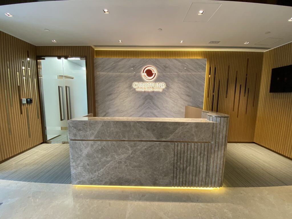 一出電梯門映入眼簾的便是一幅落地雲石特色牆,配合兩側滲光效果、牆壁上木條子設計與及接待處雲石檯面的圓角設計,打造出一個時尚簡約的空間。