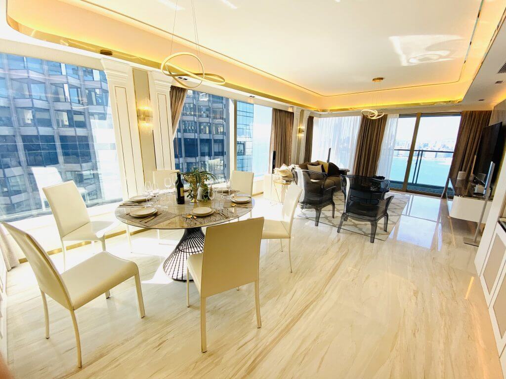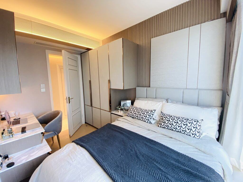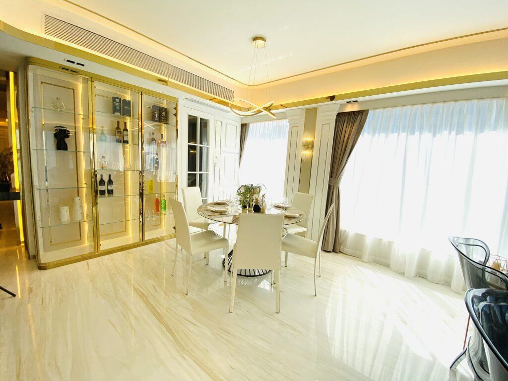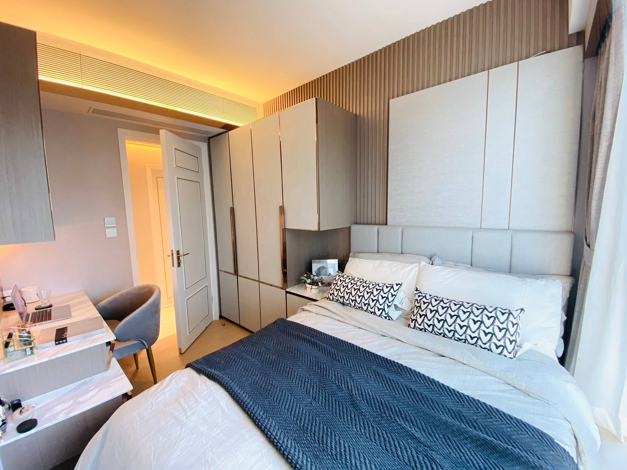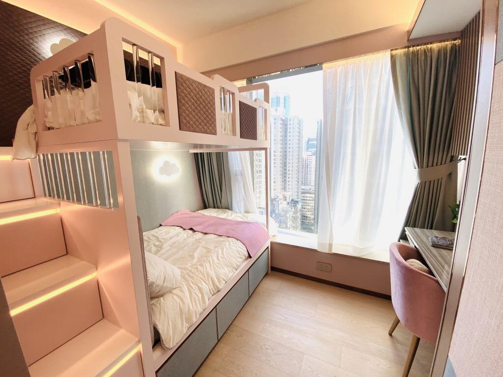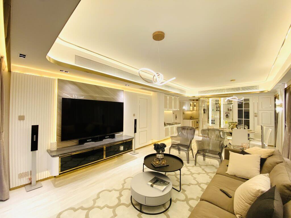 ,是次項目以現代歐式設計為主,整體以溫馨的淺色調為空間底色,由白色與米黃色系打造溫馨典雅的家居環境及大氣的歐式風情。主次分明的空間格局讓整個單位層次鮮明。客廳內更增設了一個玻璃展示櫃,可以擺放屋主的飾品,也彰顯出屋主別樣的生活品味。