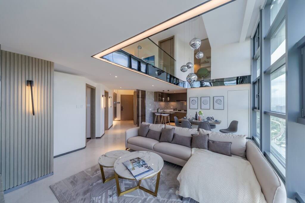 簡單的幾何造型,明亮不花俏的配色,多功能但卻可以整齊乾淨的收納都是現代風的主要訴求。現代簡約設計風強調「留白」視覺效果,通過白色和淺灰色映襯,提升空間格調質感。可見天花沒有過多花巧設計,反而以數條鋼材,映襯分隔夾層的鋼材,貫穿整個現代簡約設計概念。