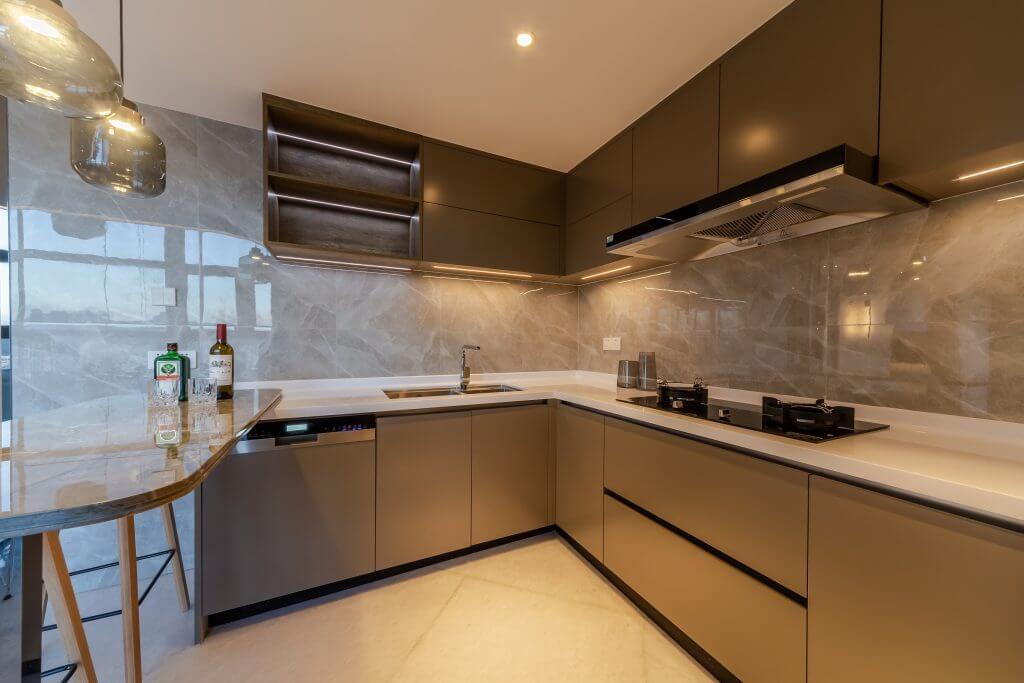 廚房以不同深淺度的灰色形成對比,極致簡練的櫥櫃造型將生活瑣碎一併收納,滿目皆是寧靜簡潔。開放式的空間讓本來面積不大的廚房寬敞明亮,純粹的色調、藝術的光源、俐落的線條,廚餘之地也能精緻大氣。