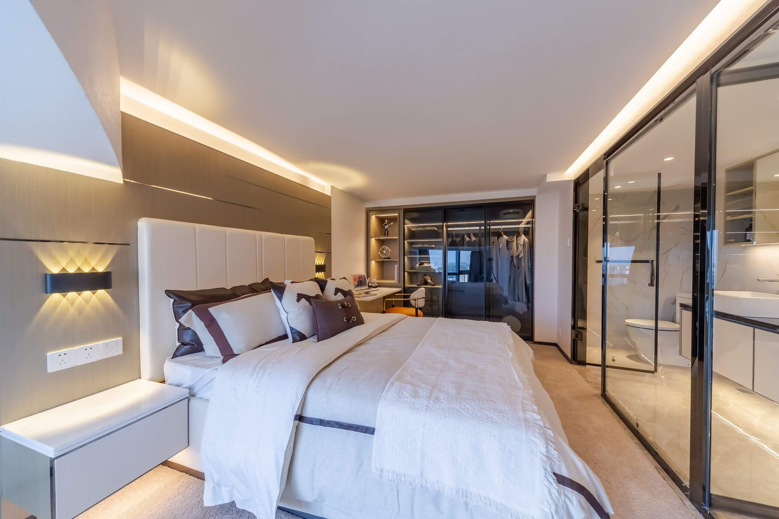 主人臥室臥室整個空間以啡色為基底,沒有過多的裝飾,簡潔的家具飾品,氣質大方,契合精緻而不失隨性的生活態度,攜引閒適自在的氛圍,整潔的空間強調舒適的休憩功能。褪去浮華,餘下便是過盡千帆後的釋然與從容。