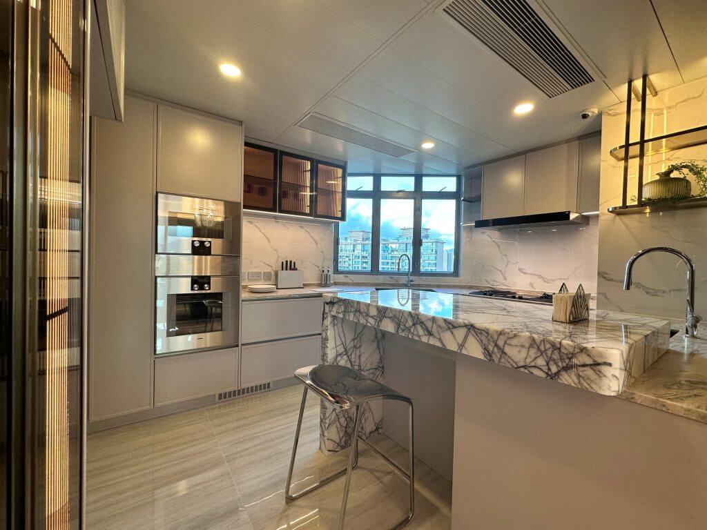 廚房半開放式大拱門,一張意大行冰玉打造的高桌,令單位設計更加帶有獨特的品味。