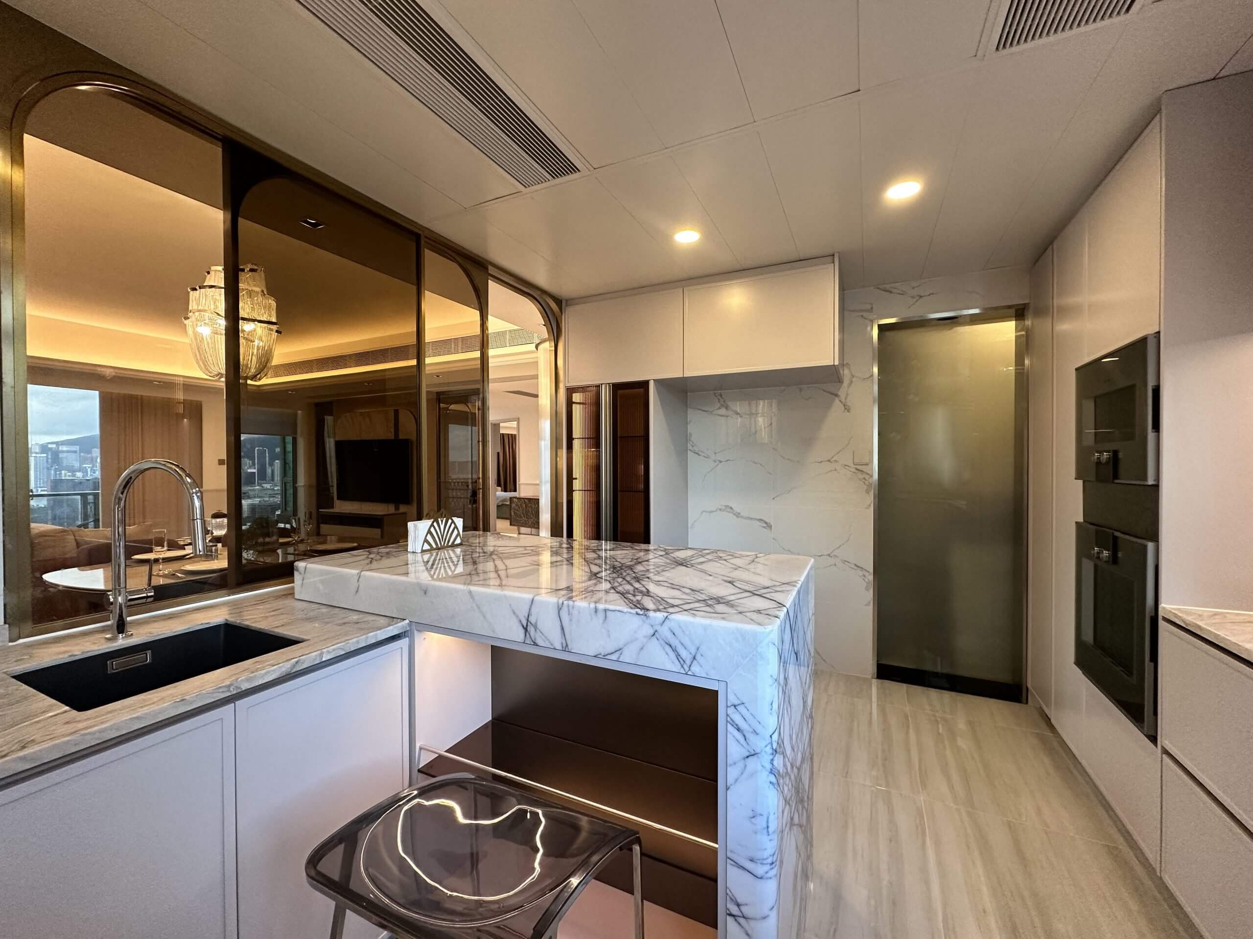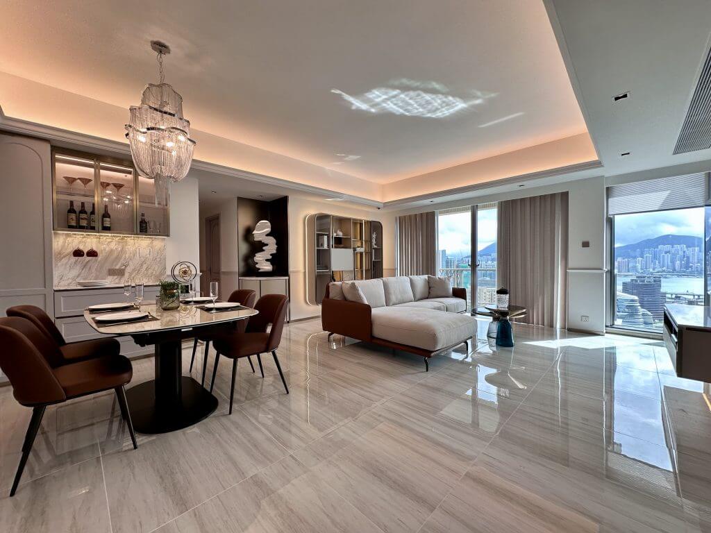 客飯廳及廚房,設計師巧妙佈局成,高,中,低,令每個位置用餐或休息時,都能夠遠眺維港景色。