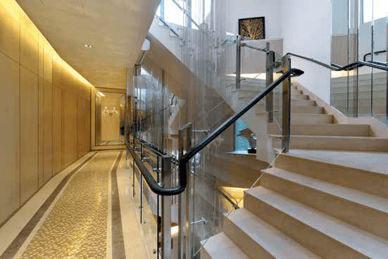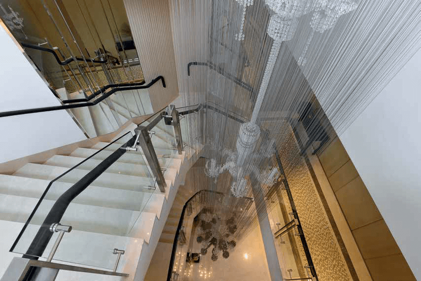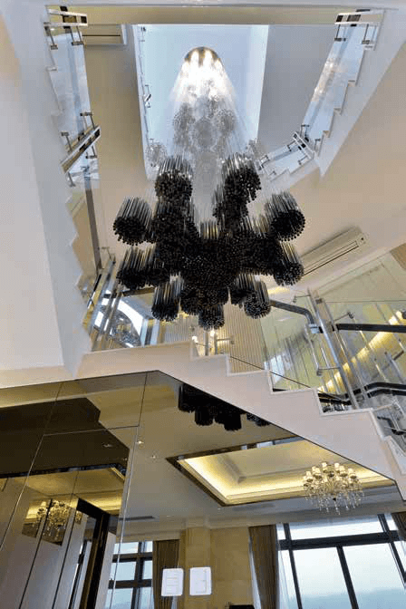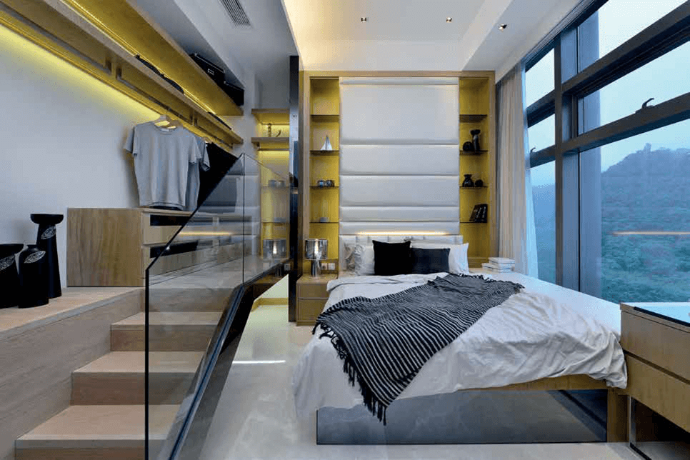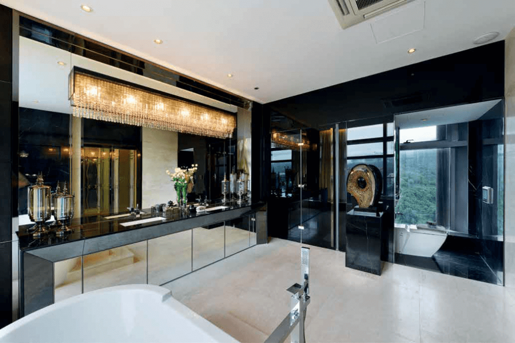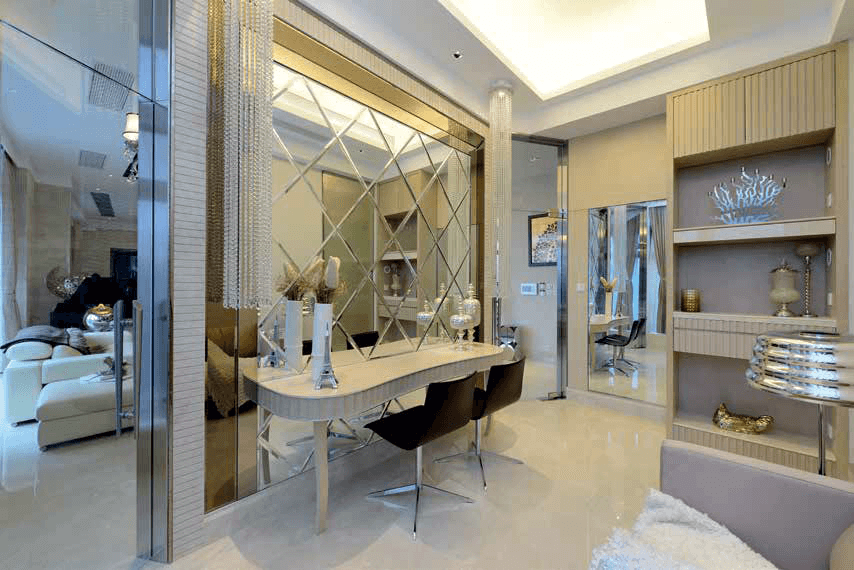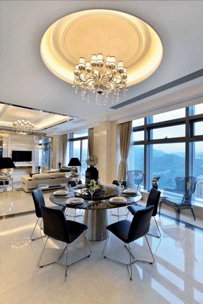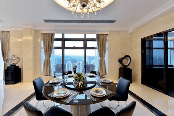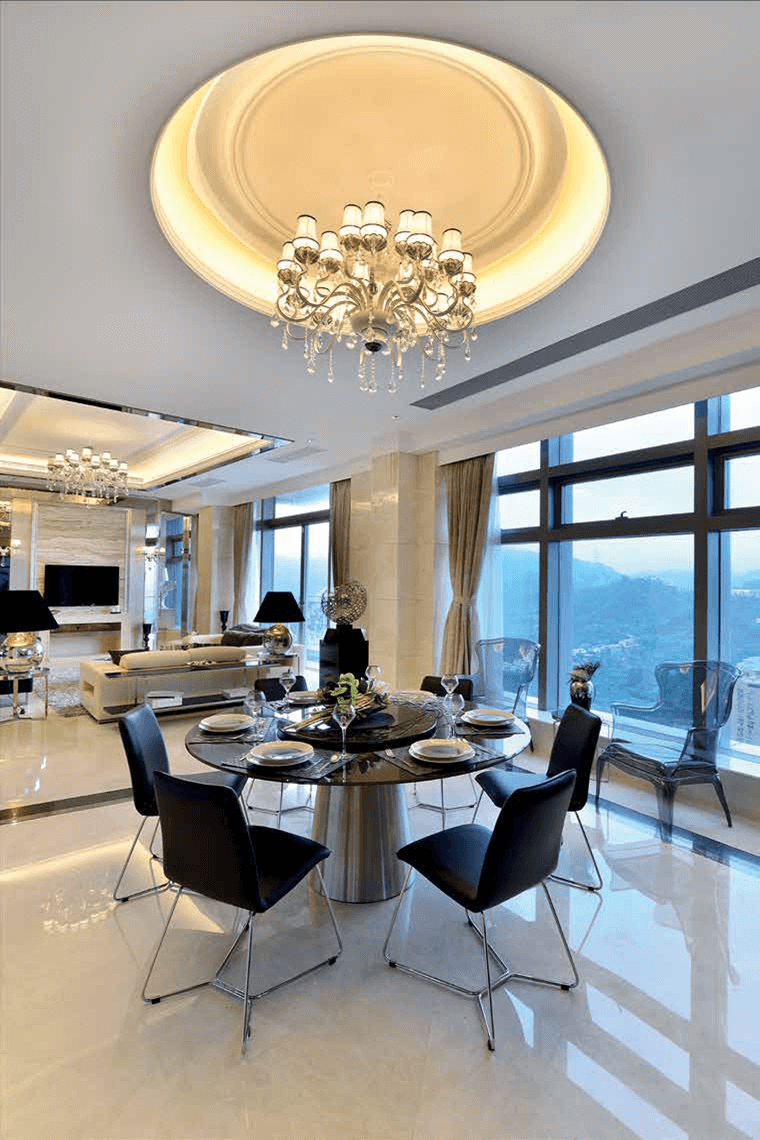 頂層複式單位俯瞰開揚景觀,透過兩層偌大的落地玻璃窗下,大圍景色盡收眼簾。典雅華麗的歐式情懷為屋主鍾情風格,雍容高雅,以建材與顏色配搭營造優雅格調。雲石的石紋及色澤層次多變,設計師以不同雲石拼砌豐富的「牆地」圖案,由各種雲石拼砌而成的地台圖案,將飯廳的角色歸納出來。雲石被切割呈不同形狀,配合特色玻璃及玫瑰金鋁片修飾,頓成一幅雅致高貴的飾牆,為地面及牆面悉心點綴,徹底展露雲石的高貴脫俗特性,與窗外的懾人景觀爭奪焦點。