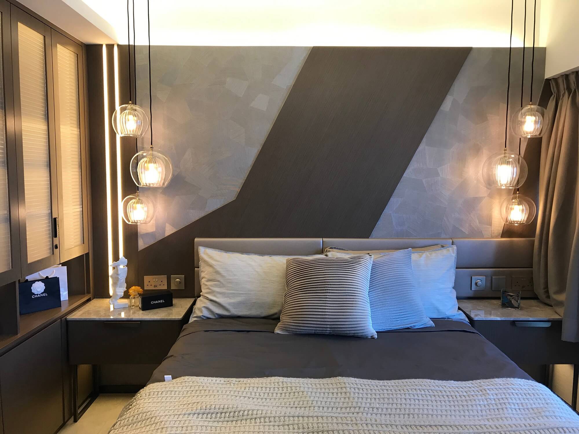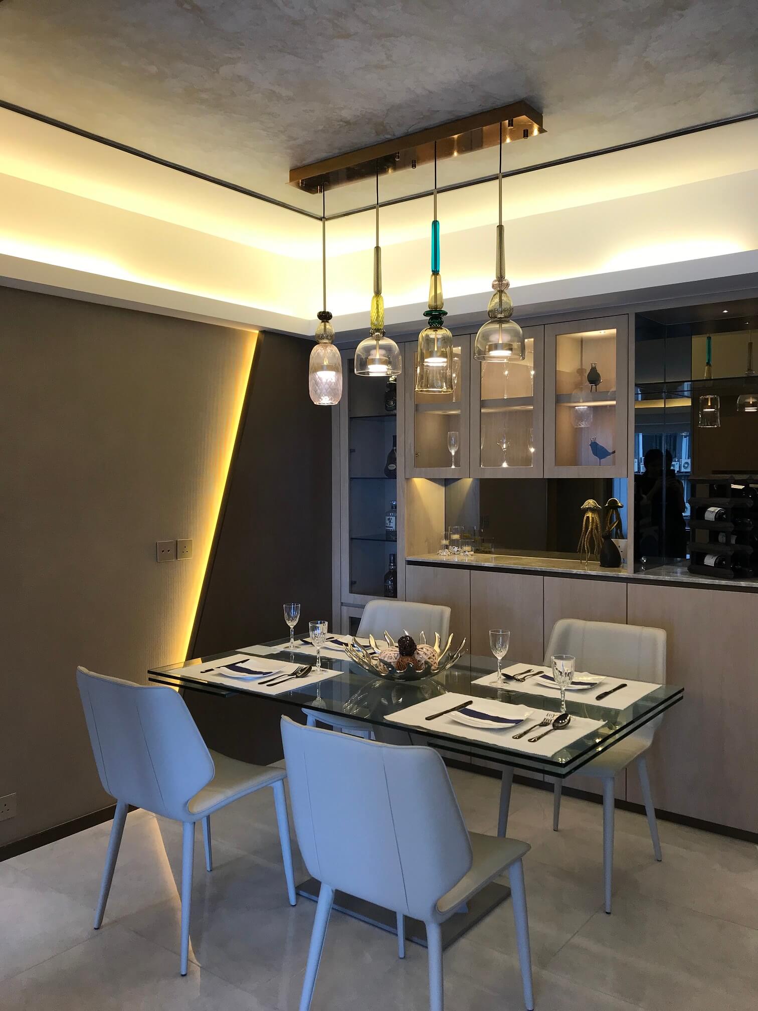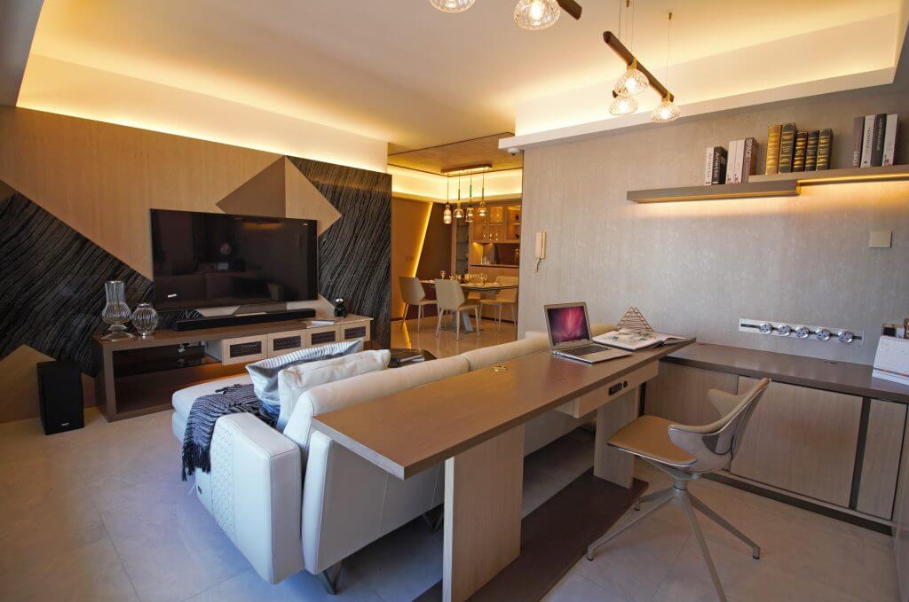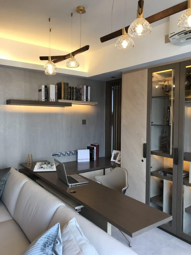 由於業主有養三隻貓,Eric 今次要為人與貓主子度身訂造,客飯廳多處採用幾何圖案,為了男業主有更多時間陪同愛妻今次的項目採用了開放式書房,大廳沙發背後就是書枱。