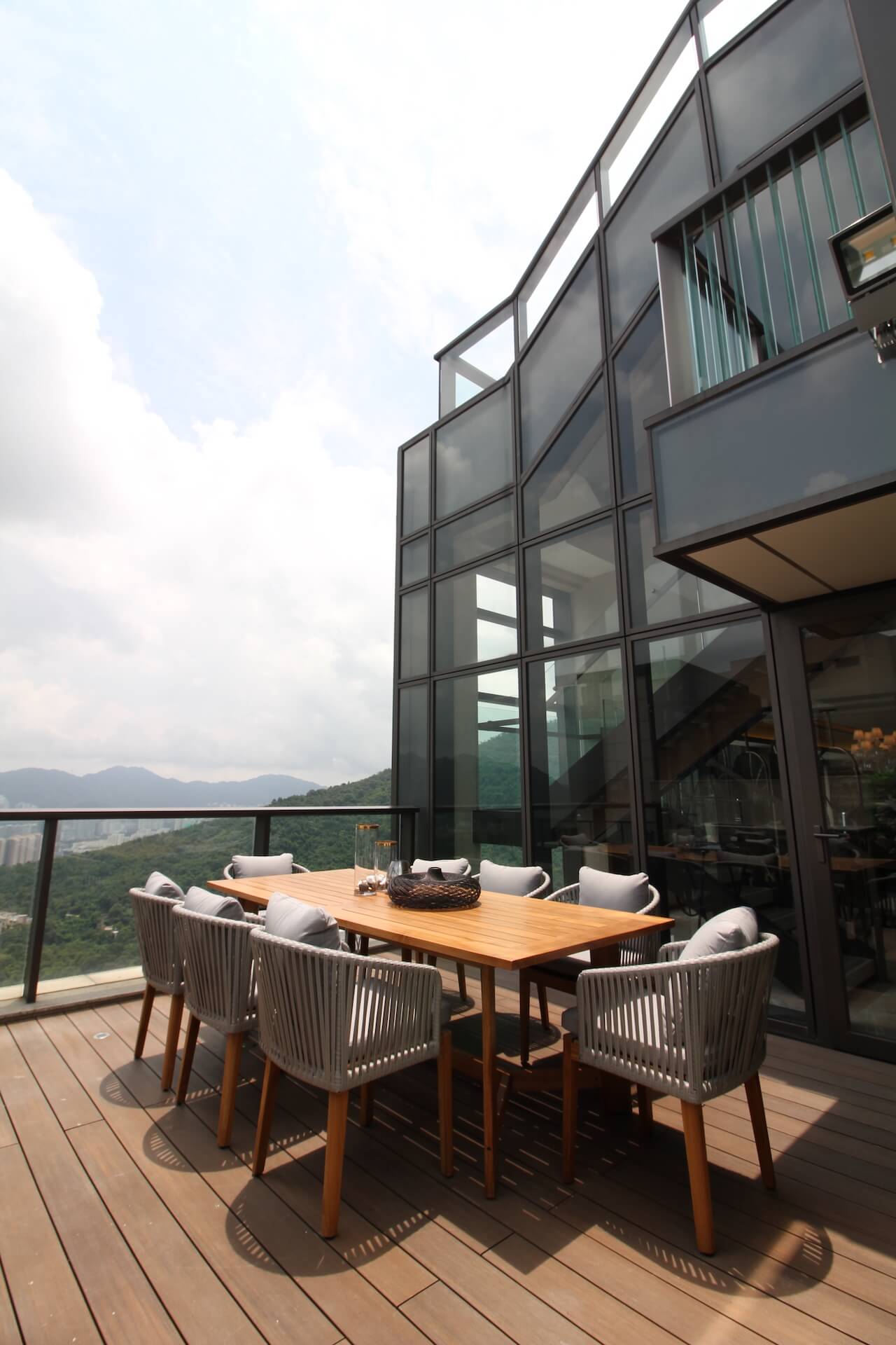 大大的陽台設有小泳池,利用簡易的戶外沙發和桌椅配置,打造出一個充滿自然氣息的多功能休閒空間。