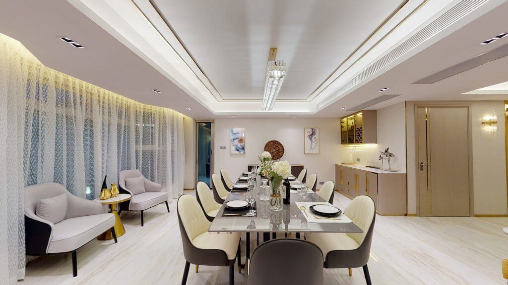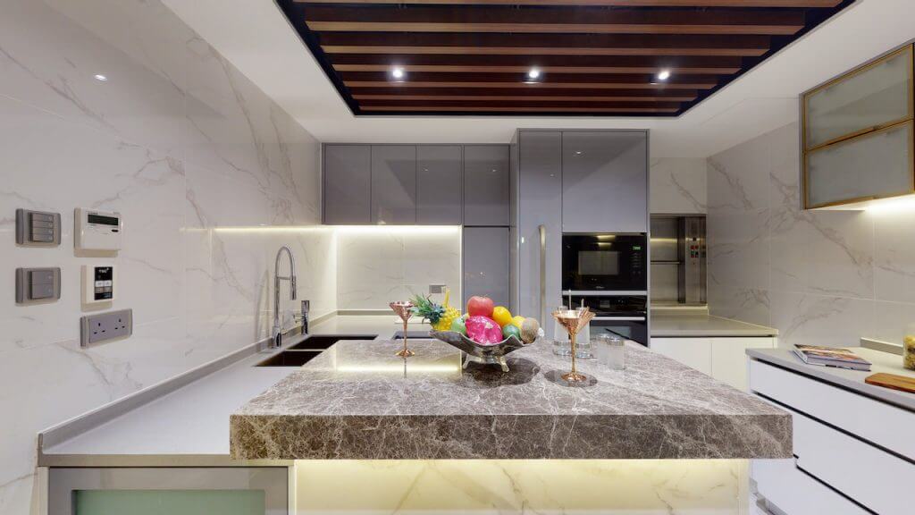 半開放式廚房採用了淺灰色的大理石吧檯面映襯整個單位灰色元素的設計,吧檯的設計為家人提供多一個休憩凝聚的地方,增加了廚房的實用性及家人之間的互動。飯廳放置長型飯枱配上水晶吊燈,盡顯氣派奢華。