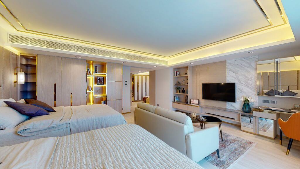 室內色調均以淺灰白色及大理石搭配為主,包括地板、茶几,浴室牆壁,都可見得到大理石元素的蹤影。它獨一無二的天然紋理以及光滑堅固的質感是它魅力的所在,亦是讓整個設計升華很重要的一環。