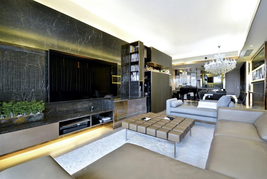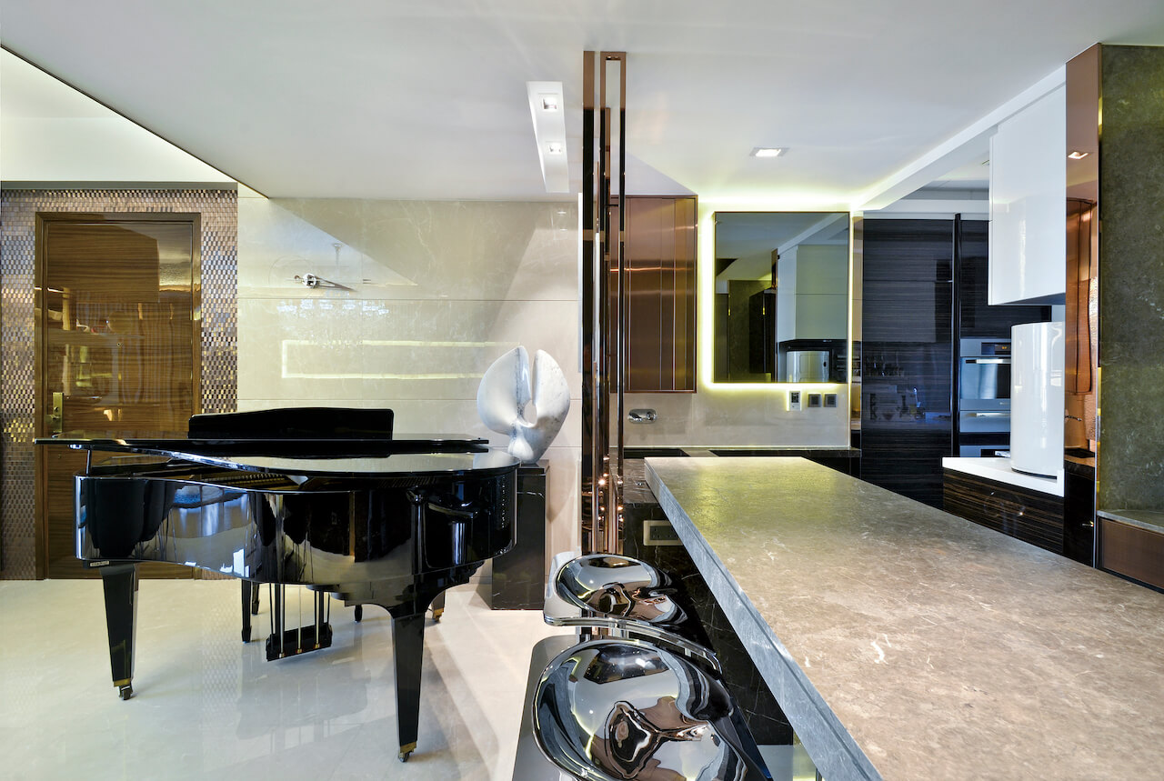 單位佈置饒富特色,以玫瑰金鋼框配3D亞加力膠製成的屏風,若隱若現,分隔廚房與飯廳,卻無阻光源進入廚房,閃爍華麗,與廳區內的回憶牆爭奪焦點。
