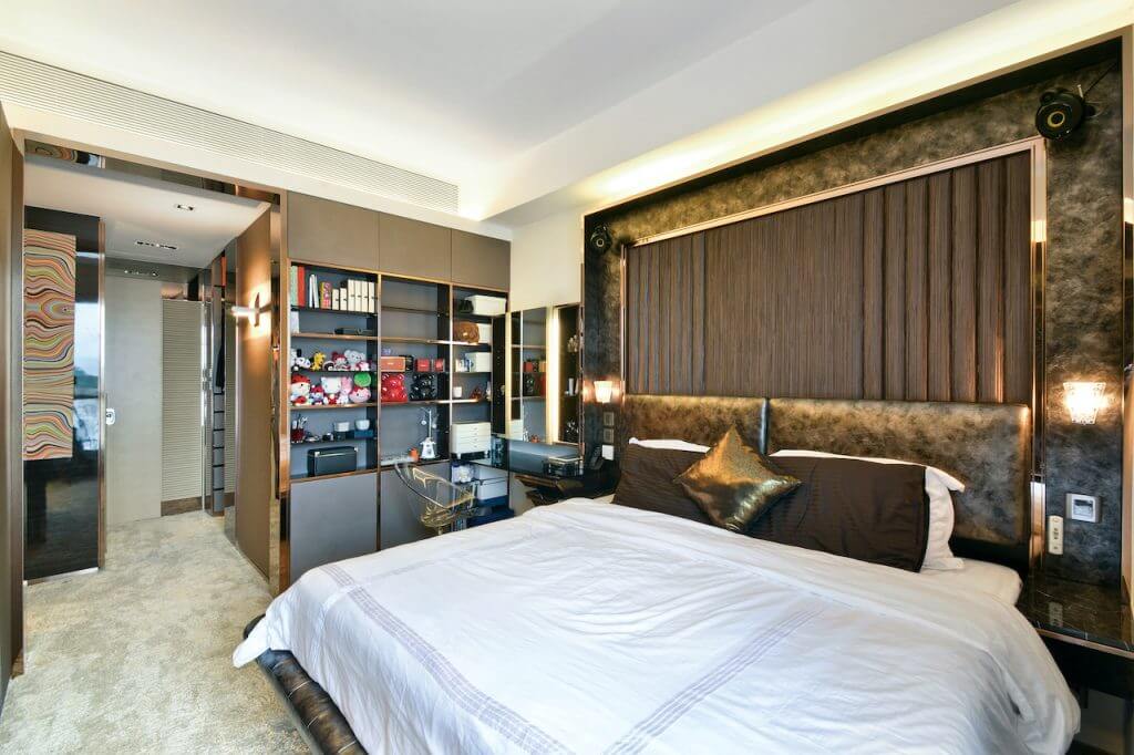 深啡色是經典奢華風的不可缺少的顏色,能讓整個主人房感覺氣質莊重沉穩,隱約中透著高雅的氣息,運用燈光的配合,令深色的牆身不會帶有昏暗感。