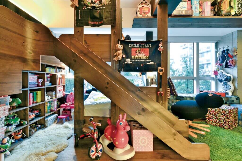 孩子勇於接受新事物,一般的公主床未能滿足她們的需要,ERIC設置上下格睡房毗連玩樂滑梯,連同訪邊的抽屜梯級,姐妹游走于這組玩味睡床,樂在其中。