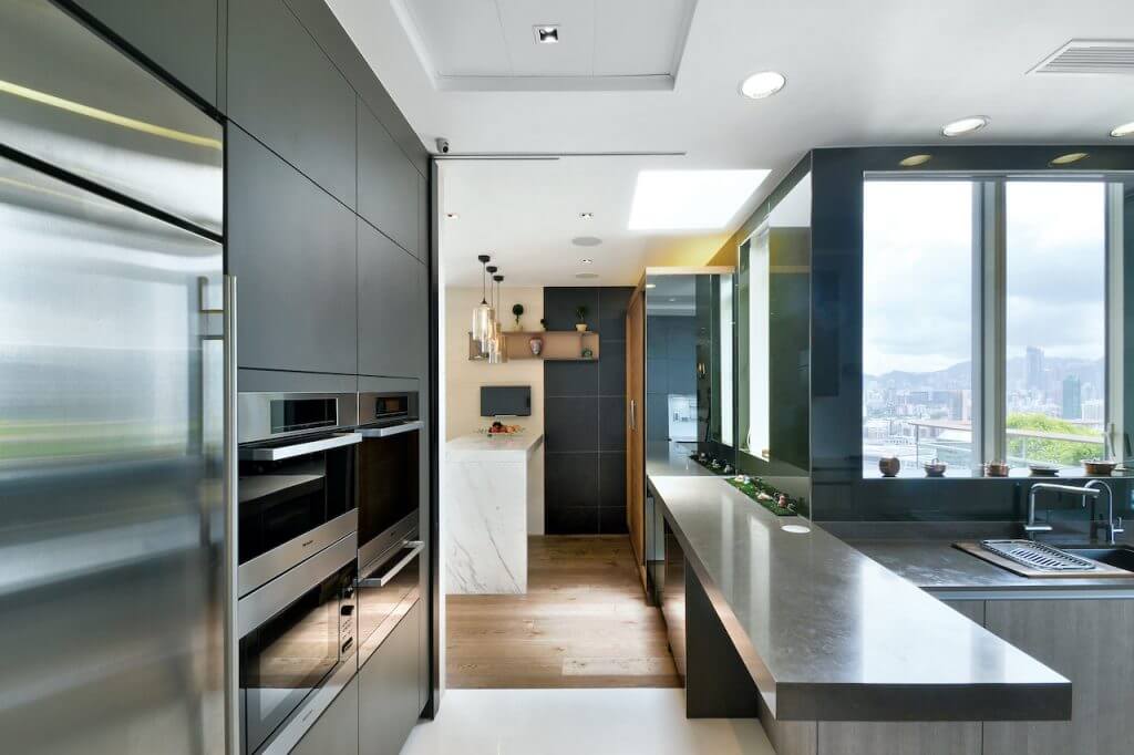 屋主期望居所巨有寬裕空間感,客廳以自然大地色系為主,塑造視覺上的輕型無壓感,再以清玻璃及砂鋼飾面與主色調形成強烈對比。居高臨下的單位條件配以簡單多面落地大玻璃及扇天窗,除了將區內景致一覽無遺更可輕易引入自然光。