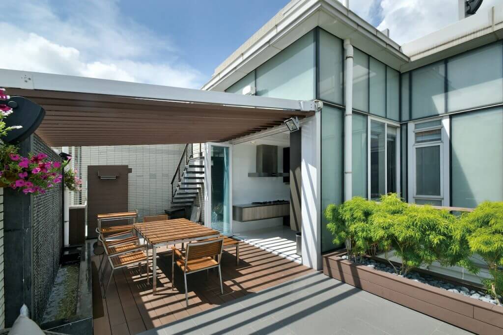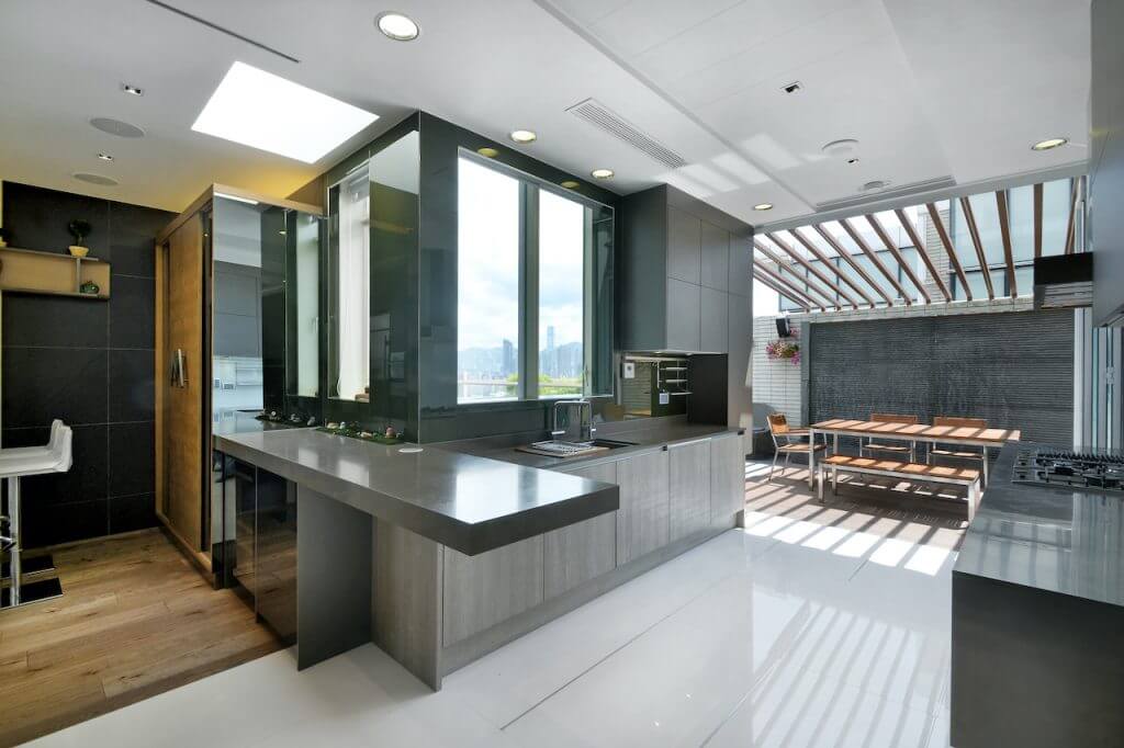 廚房亦利用玻璃引入充沛光線,當趟開玻璃門達致裡外連貫,擴闊空間。作開放式規劃的廚房極具空間感,工作檯面以黑色人造石焗漆的全高櫃搭配啞色木飾面地櫃,效果稍作變化。房間突顯獨特個性,女兒房以木色作主導,床頭牆以松木飾面更延伸至天花加入霓虹燈點綴。
