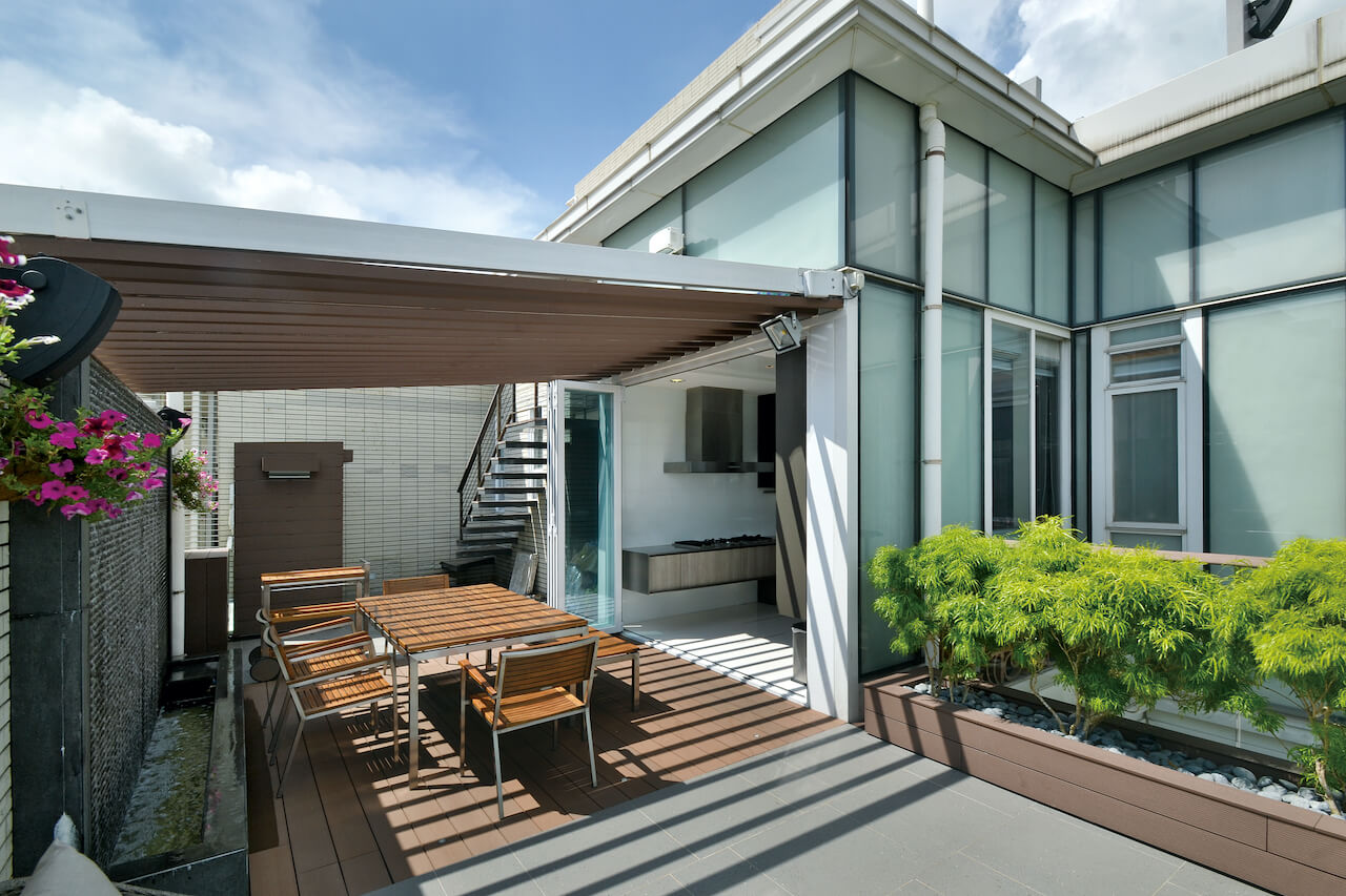 厨房亦利用玻璃引入充沛光线,当趟开玻璃门达致里外连贯,扩阔空间。作开放式规划的厨房极具空间感,工作台面以黑色人造石焗漆的全高柜搭配哑色木饰面地柜,效果稍作变化。房间突显独特个性,女儿房以木色作主导,床头墙以松木饰面更延伸至天花加入霓虹灯点缀。