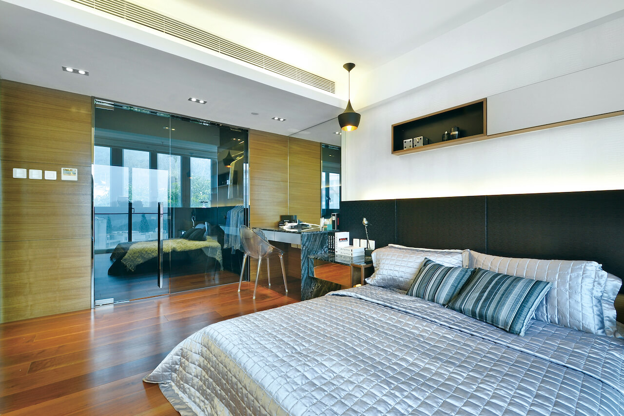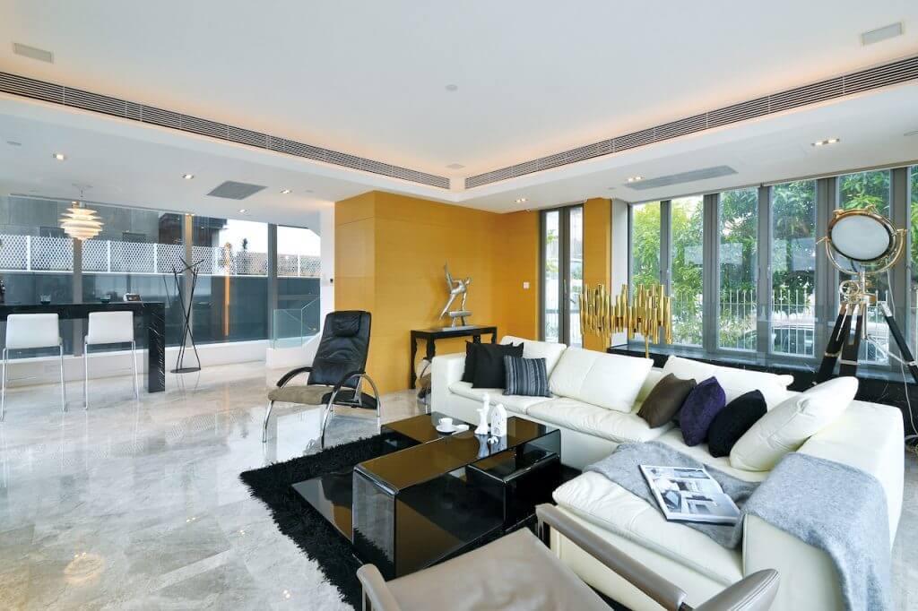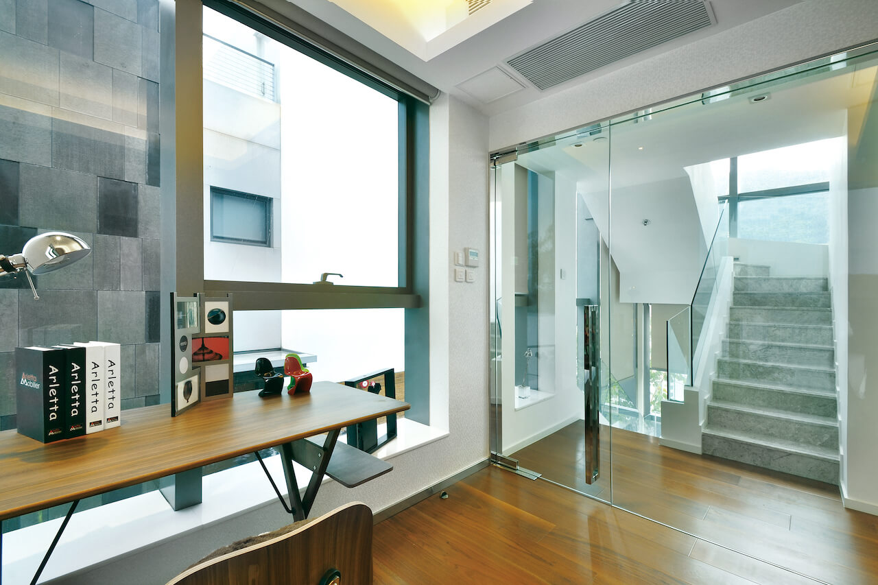 独立屋建筑型格时尚,处于白屋群之闻,玻璃屋显得格外夺目在落地玻璃幕墙分隔下,屋内外连贯紧密,玻璃物料清澈透视,窗外开扬舒泰的㣾观尽收眼底 。